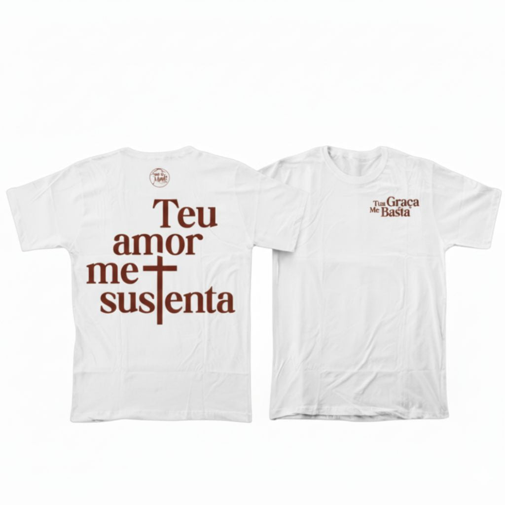 A camiseta “Tua Graça Me Basta / Teu Amor Me Sustenta” é inspirada nas palavras de São Paulo (2Cor 12,9) e também em uma das canções mais emocionantes do Frei Gilson, que nos recorda: é o amor de Deus que nos sustenta diariamente.