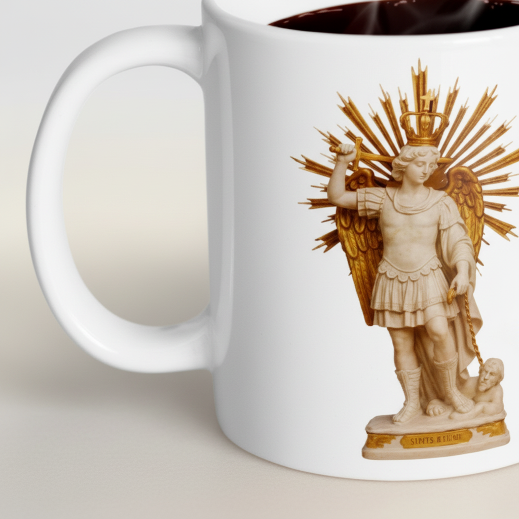 Caneca em cerâmica “40 dias com São Miguel Arcanjo”, ideal para acompanhar momentos de oração e devoção. Perfeita para quem deseja fortalecer a fé e a proteção espiritual no dia a dia, unindo espiritualidade e utilidade.