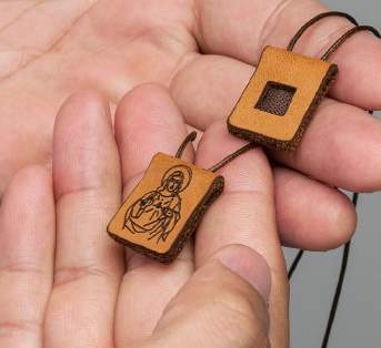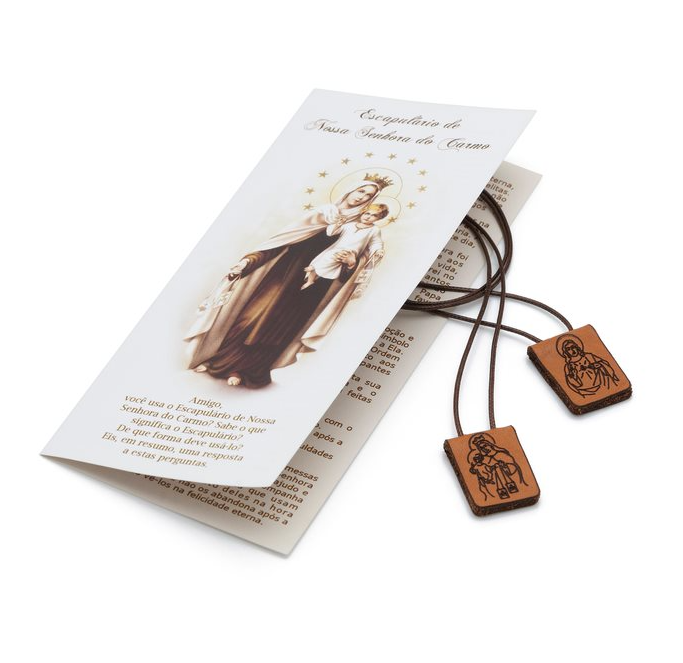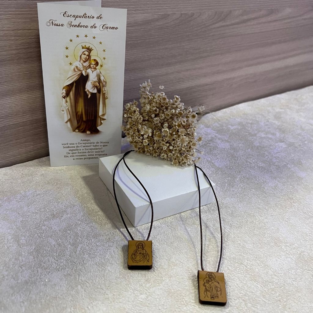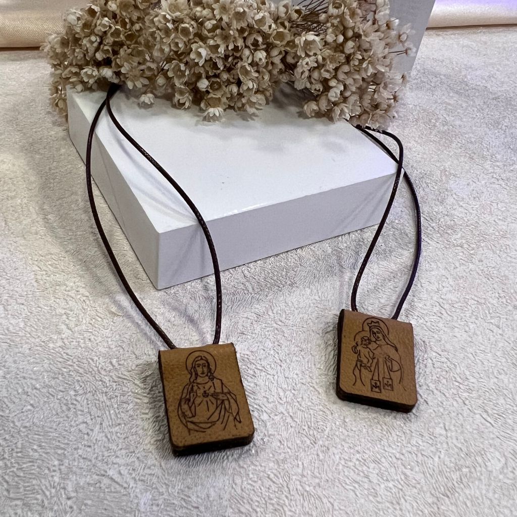 Escapulário em couro Nossa Senhora do Carmo é composto por duas faces de couro natural e cordão de 1 mm, possui em seu verso um lindo detalhe, um tecido que representa o manto de Nossa Senhora do Carmo e em outra face o Sagrado Coração de Jesus, as imagens são impressas a laser e acompanha um folheto explicativo sobre o uso do escapulário.